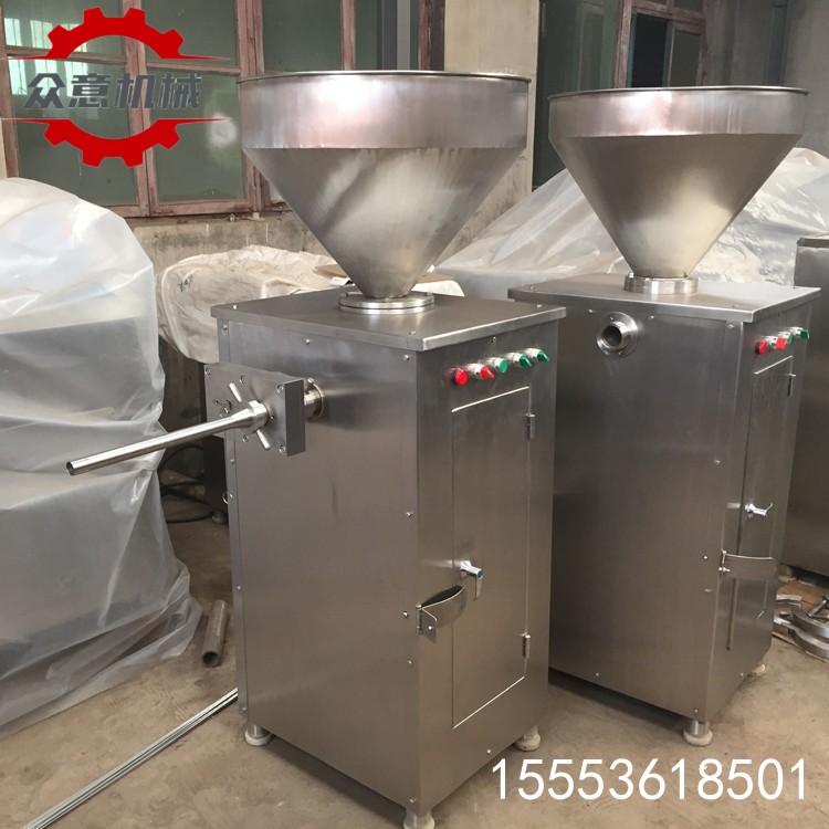气动定量扭结灌肠机,适合灌装各种、火腿类产品,适合天然肠衣、胶原、烟熏肠衣。此机体积小,投入低,适用于中、小型肉制品加工企业。改变了以往灌肠机只灌肠,不能自动扭结的现状。能灌制大中小各种规模的肠制品。该产品外观美观,做工精良,操作方便,使用 可靠。该机的料斗,阀门,灌肠管及整机外包装均采用优质不锈钢制造。